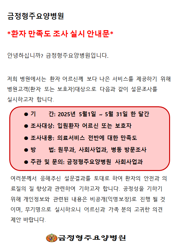 목록 2025년 환자 만족도 조사 실시 페이지 정보 작성자최고관리자 댓글0건 조회640회 작성일25.04.30 13:28 본문 이전글6월 프로그램 일정표 25.05.30 다음글5월 프로그램 일정표 25.04.30 댓글 0 댓글목록 등록된 댓글이 없습니다.